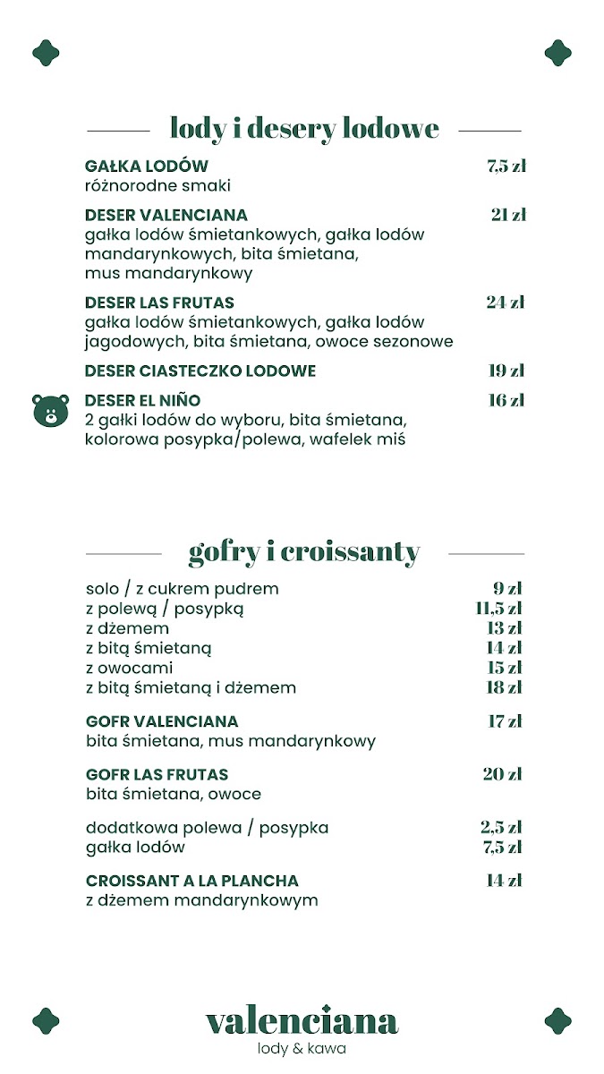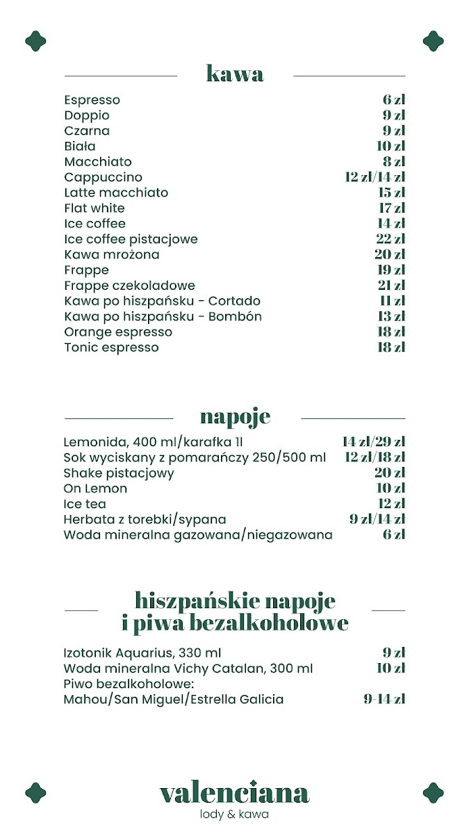 Valenciana lody & kawa Menu